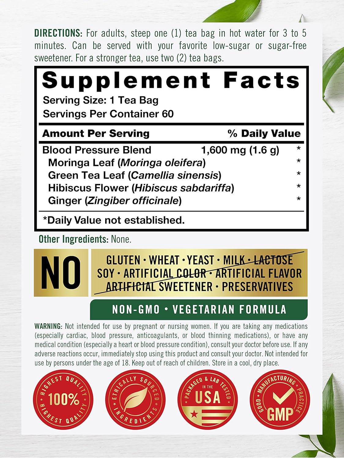 Blood Pressure Blend. Moringa Leaf (Moringa oleifera), Green Tea Leaf (Camellia sinensis), Hibiscus Flower (Hibiscus sabdariffa), Ginger (Zingiber officinale).