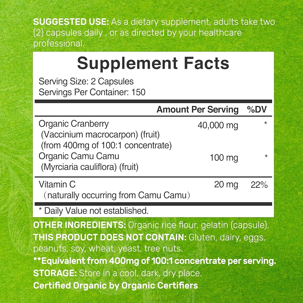 - Special Features – 4x strength cranberry with camu camu capsules, 40,000mg organic cranberry and 100mg organic camu camu per dose, 2-in-1 superfruit complex made with certified organic ingredients, providing unmatched quality and potency