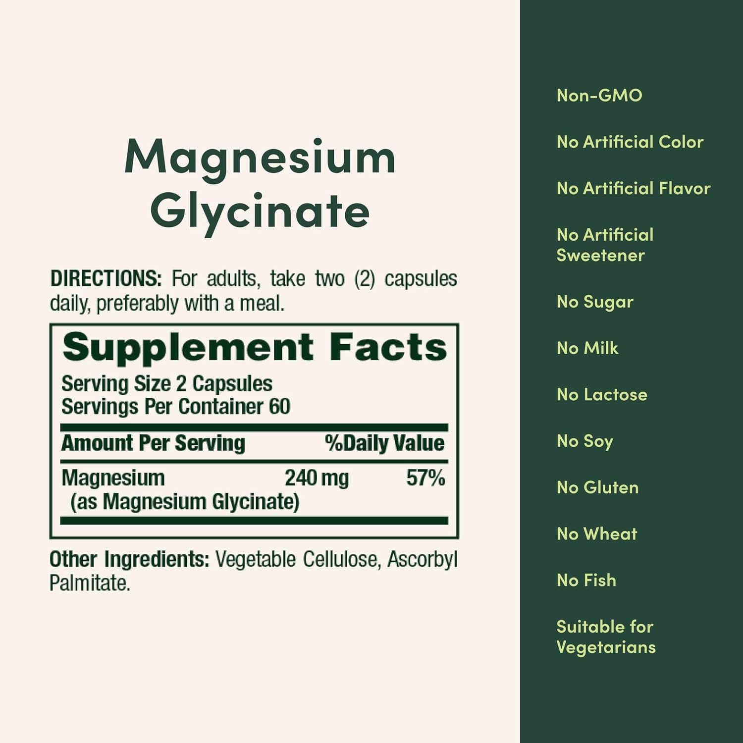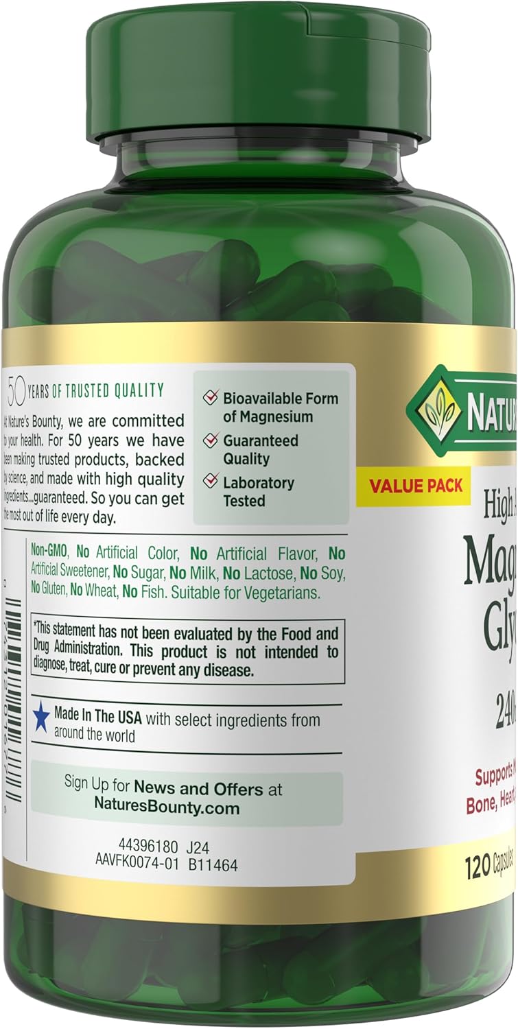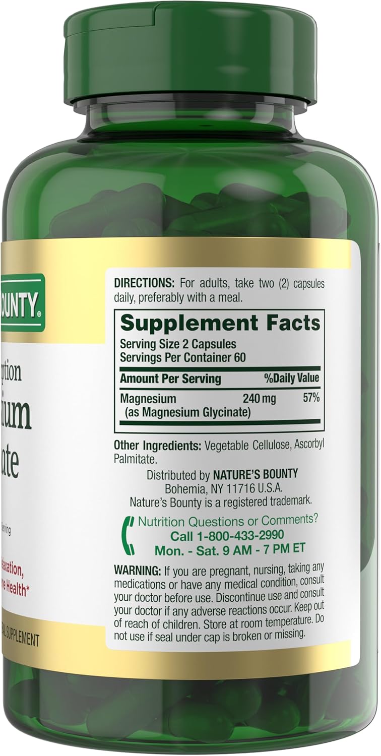 - SUITABLE FOR MANY DIETARY PREFERENCES: Nature’s Bounty High Absorption Magnesium Glycinate is suitable for vegetarians; non-GMO; gluten-free; lactose-free; and contains no sugar; sodium; or artificial colors and sweeteners
