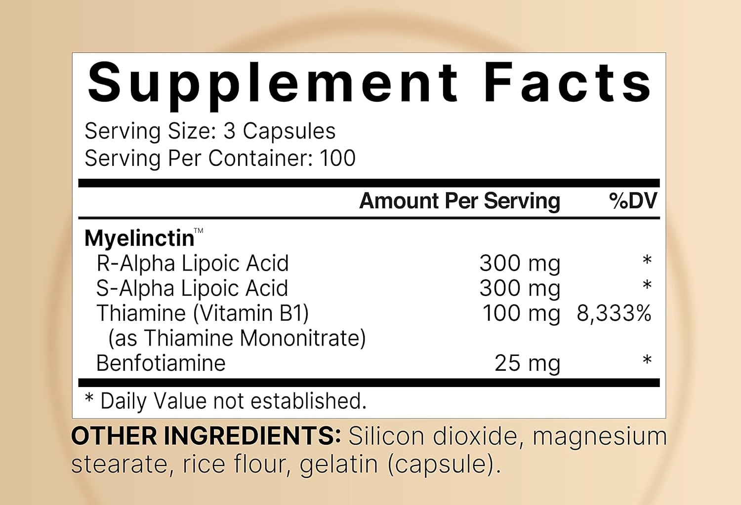 - Efficiently absorbed ALA capsules 600mg with the special Myelinctin formula. A high bioavailable 4-in-1 water and fat soluble combination that includes 300mg R-Alpha Lipoic Acid, 300mg S-Alpha Lipoic Acid plus 100mg Thiamine Mononitrate, and 25mg Benfotiamine.