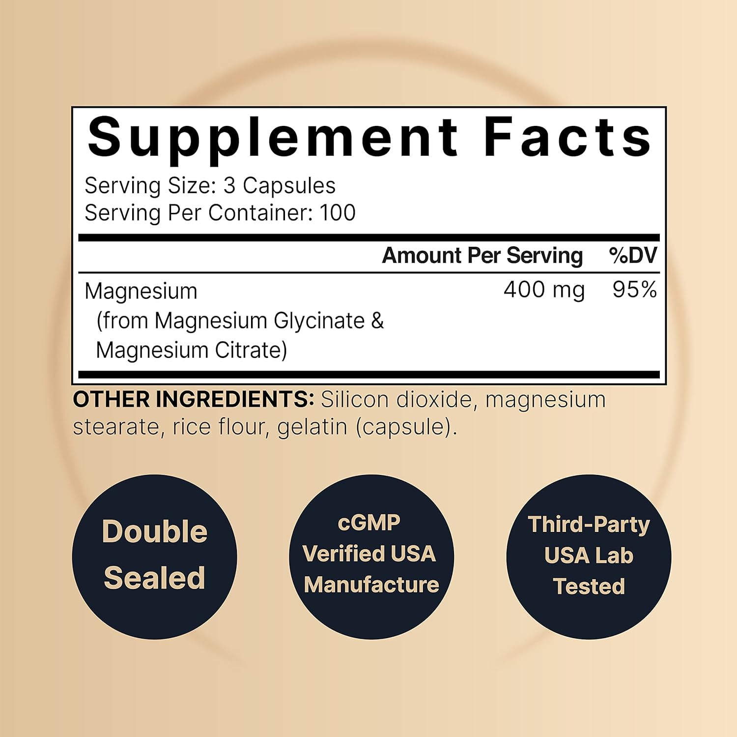 - High potency full elemental magnesium glycinate with citrate capsules. 2 in 1 essential trace mineral nutrients. Optimal bioavailable forms that are easy on the stomach and efficiently absorb into the body.