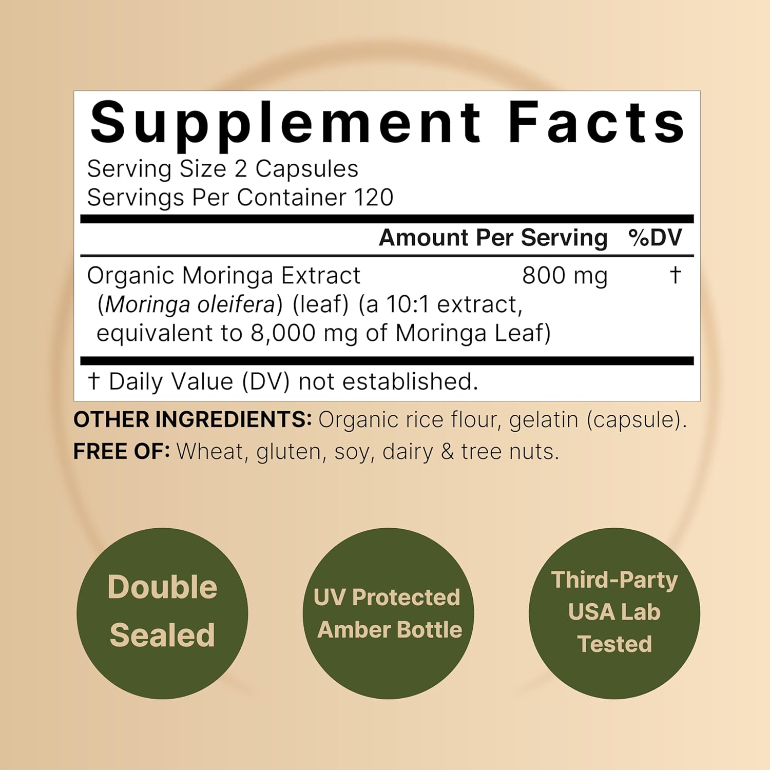 - Authentic non-GMO and non-Irradiated moringa supplement. Contains pure ingredients free of soy, dairy, gluten, preservatives, wheat, fish, eggs, and peanuts. All products are also 3rd party lab tested for safety and potency.