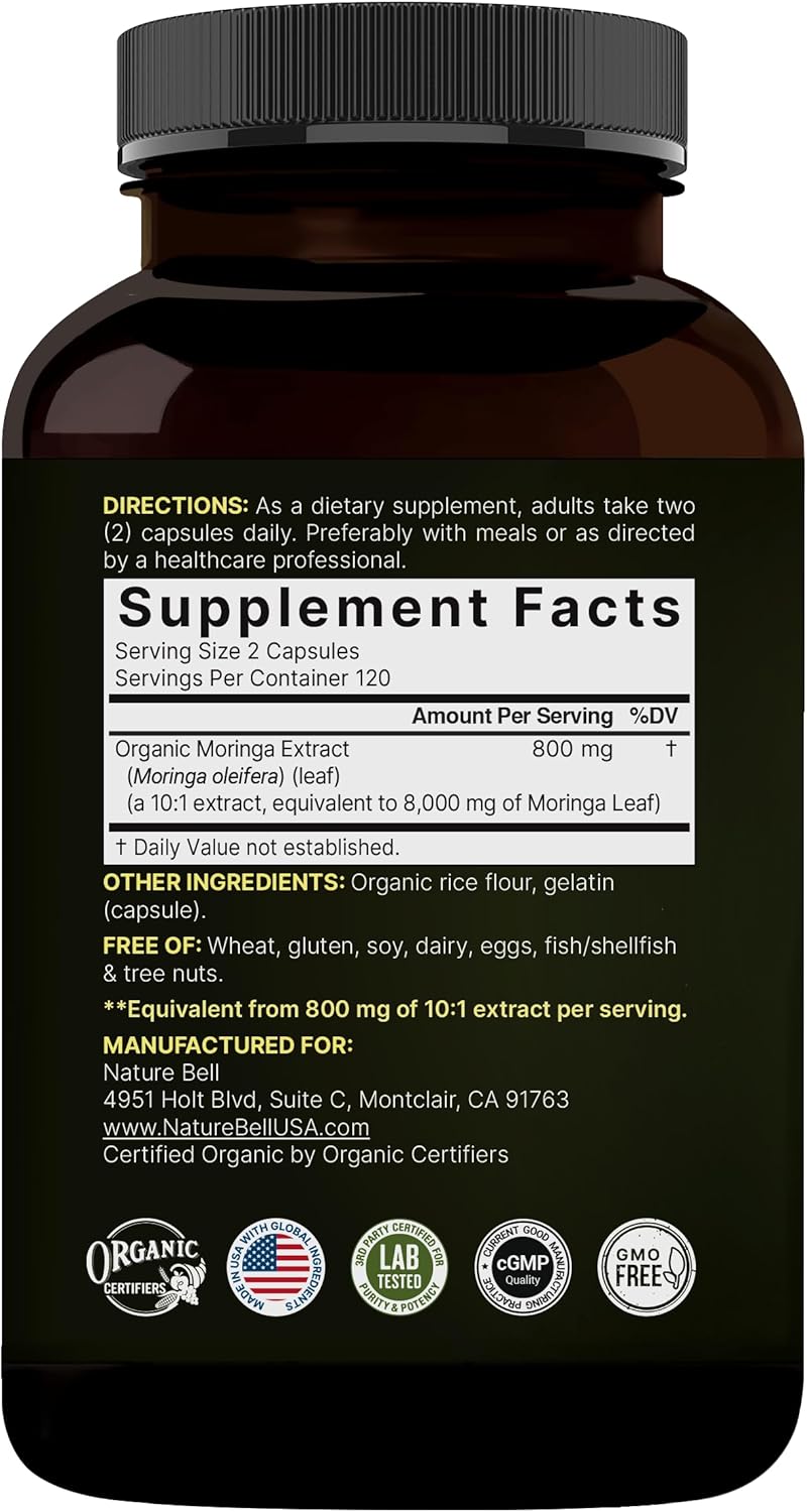 - NatureBell’s moringa is extracted from fresh leaves that are harvested on Indian farms, helps retain high levels of antioxidants, minerals, essential amino acids, vitamins, natural fiber, polyphenols, and flavonoids.