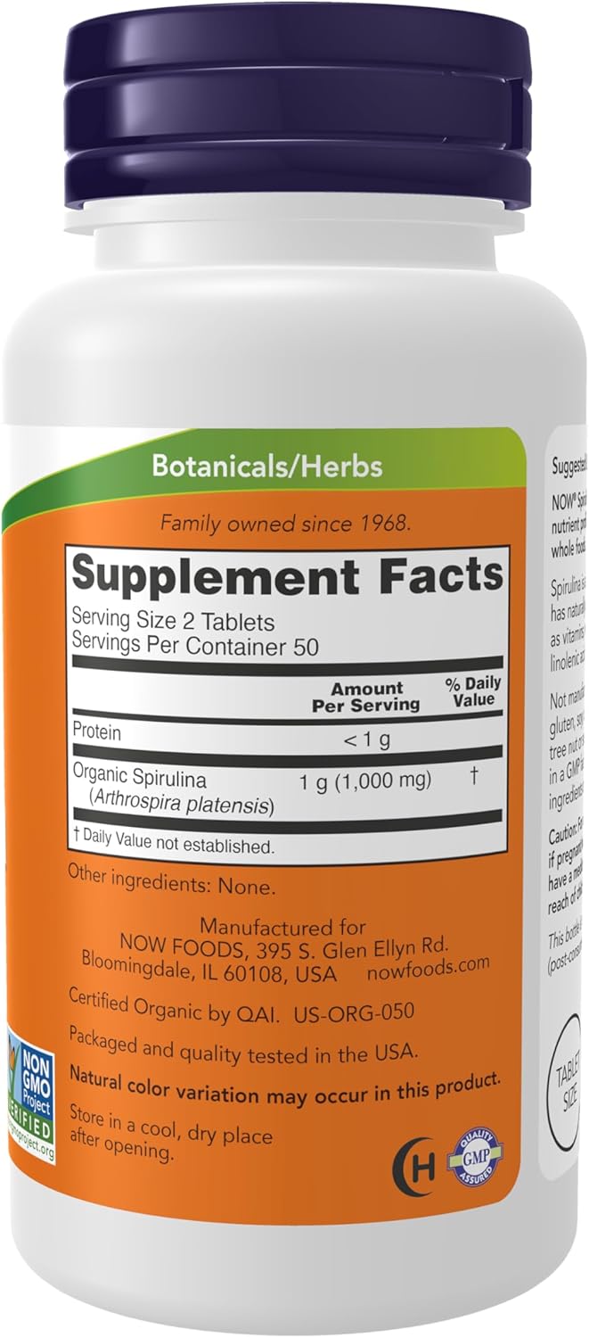 🌿 NOW Certified Organic Spirulina – 3,000mg – 100 Tablets (500mg per Tablet) | Superfood for Energy, Immunity & Detox