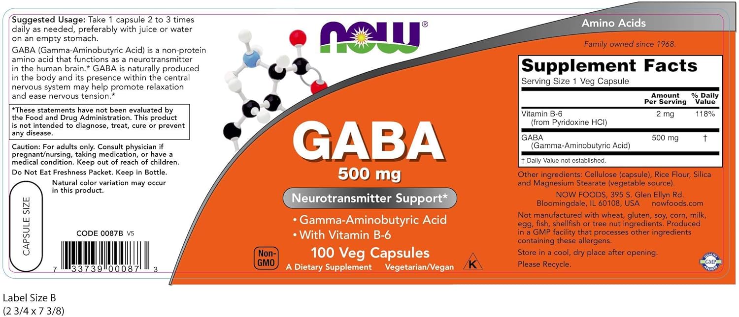 💊 NOW GABA with Vitamin B-6 – 500mg – 100 Veg Capsules