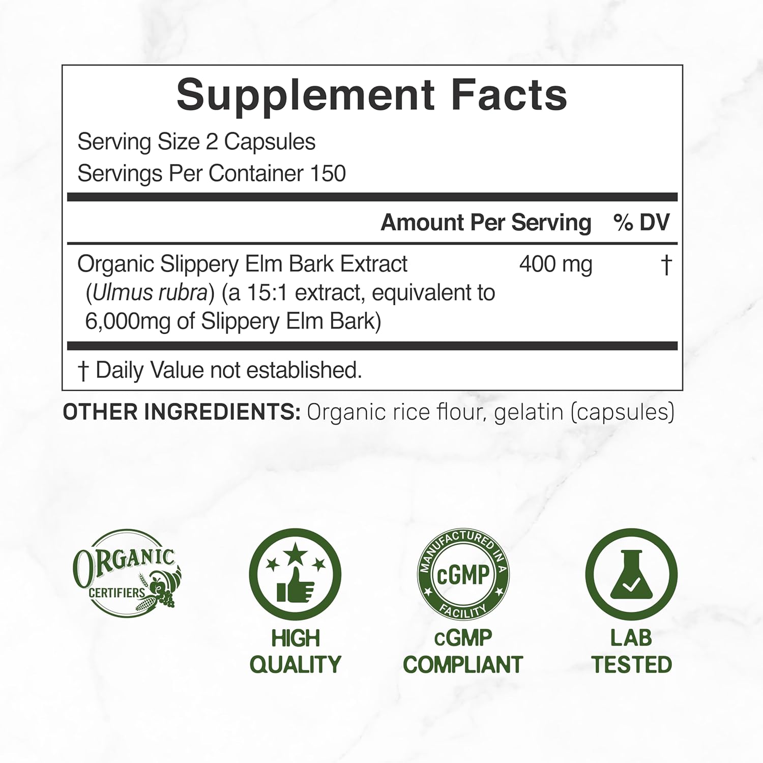 - Dosage & Servings – 300 capsules per bottle, 2 capsule serving size, delivers 6,000mg organic slippery elm bark as ulmus rubra from 400mg of a 15:1 extract per dose, 150 servings.