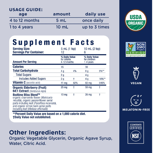 Formulated with certified organic ingredients and designed specifically for infants and toddlers, this bedtime drops blend offers gentle, natural support for sleep and immunity