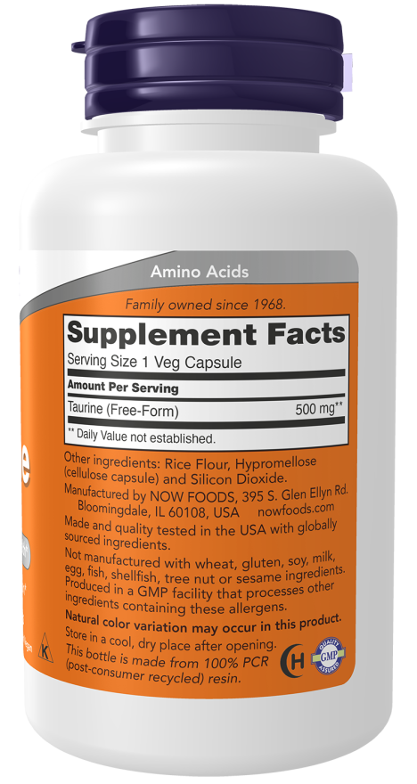 NOW Taurine 500mg is a potent amino acid supplement that helps support energy production, cardiovascular health, and nervous system function.