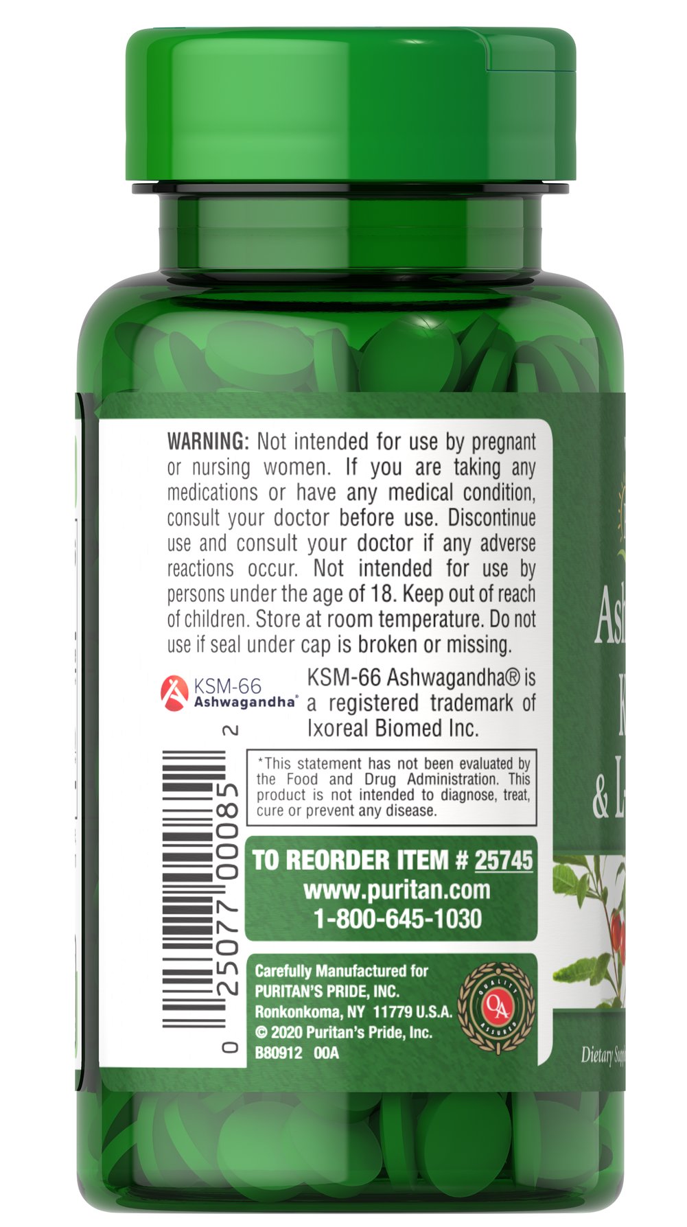 Puritan's Pride Ashwagandha KSM-66 & L-Theanine - 60 Tablets