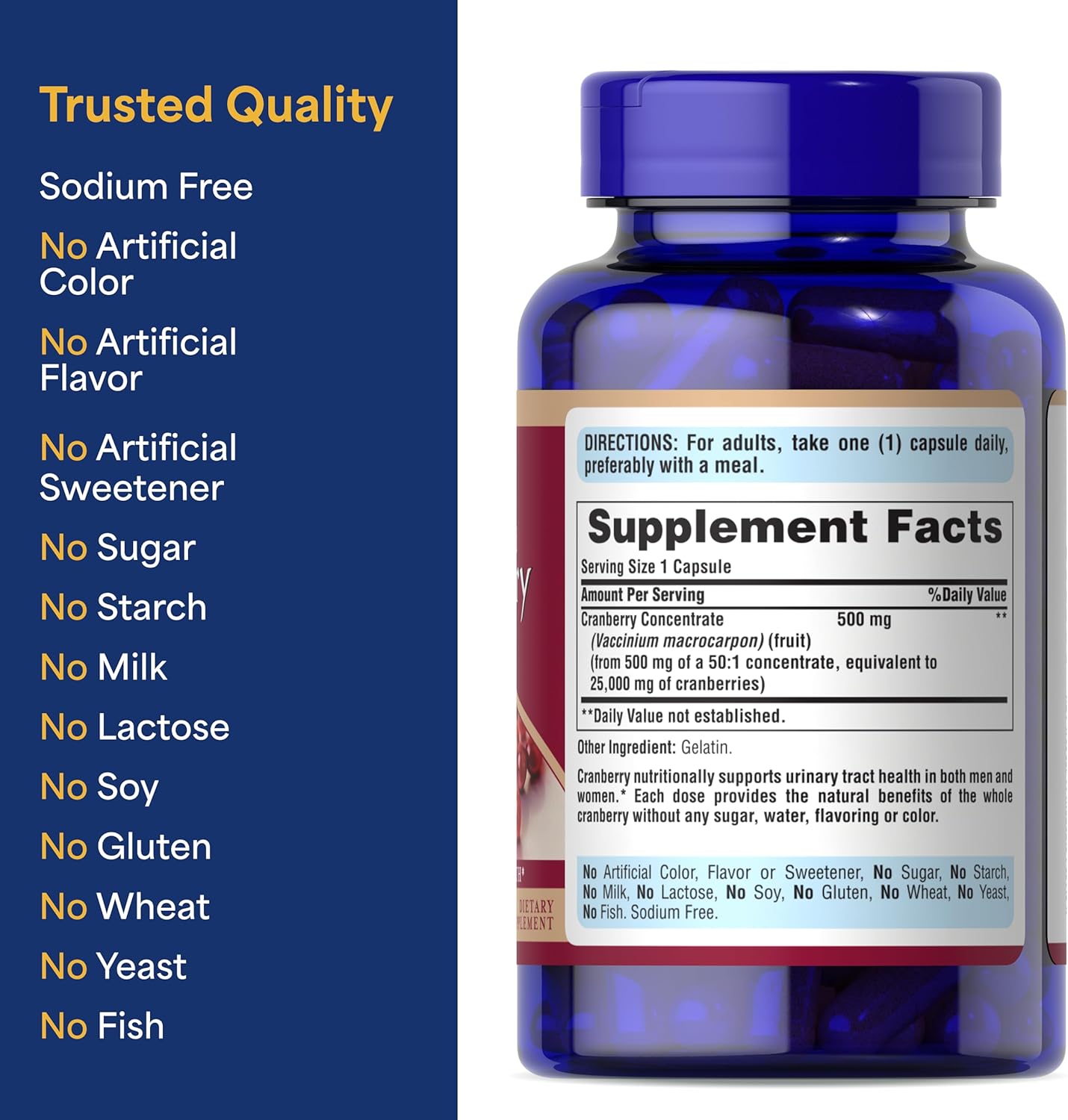 🍒 Puritan’s Pride Naturally Sourced Cranberry Fruit Concentrate – 500mg | 120 Rapid Release Capsules