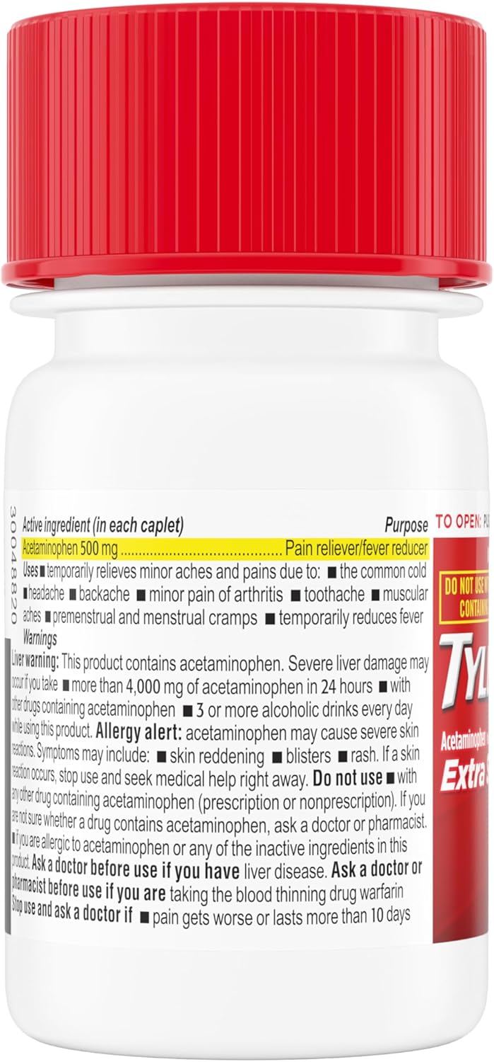 Get fast and effective relief from pain and fever with Tylenol Extra Strength 500mg. Trusted worldwide, Tylenol contains acetaminophen, a proven active ingredient that helps reduce mild to moderate pain and lower fever. Ideal for headaches, muscle aches, back pain, and general discomfort, it provides reliable support for everyday wellness. ⚡